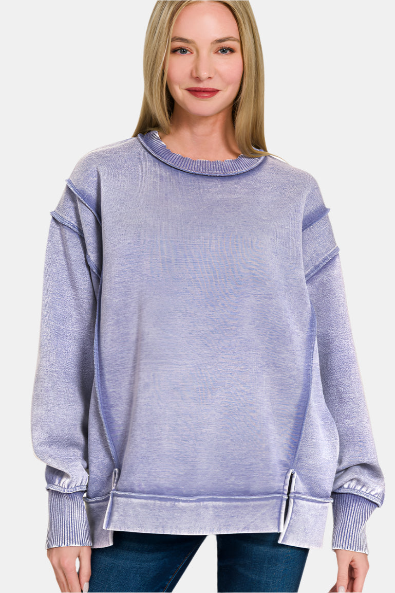Soft acid washed fleece brings comfort and style to a casual-day sweatshirt finished with side slits and exposed seam details.