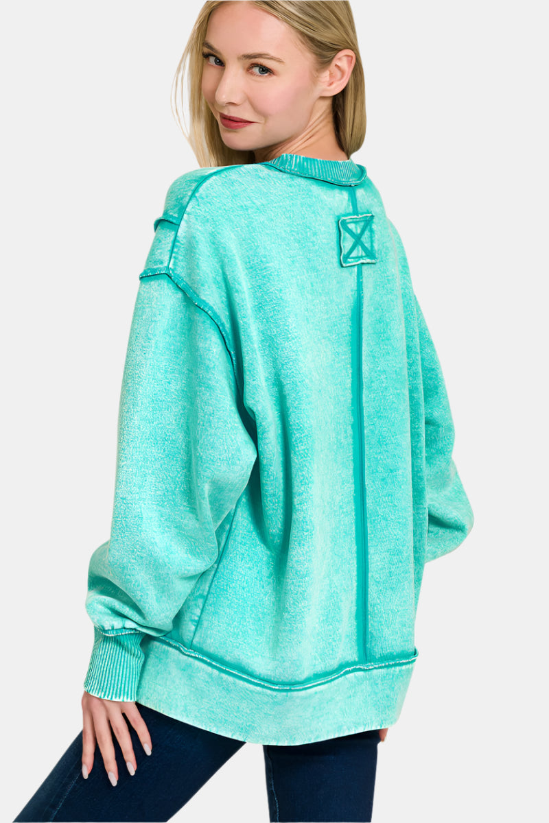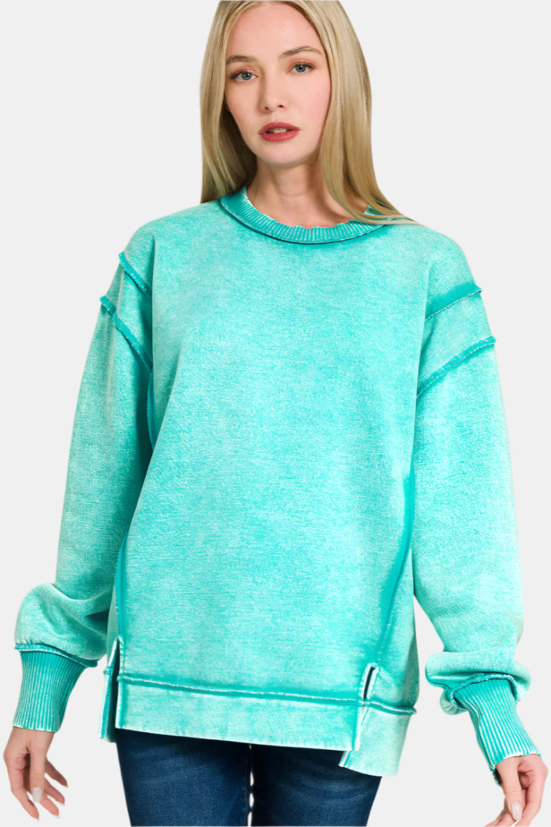 Acid Wash Exposed-Seam Fleece Sweatshirt / TURQUOISE