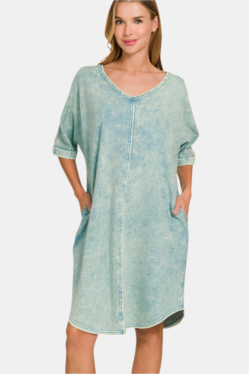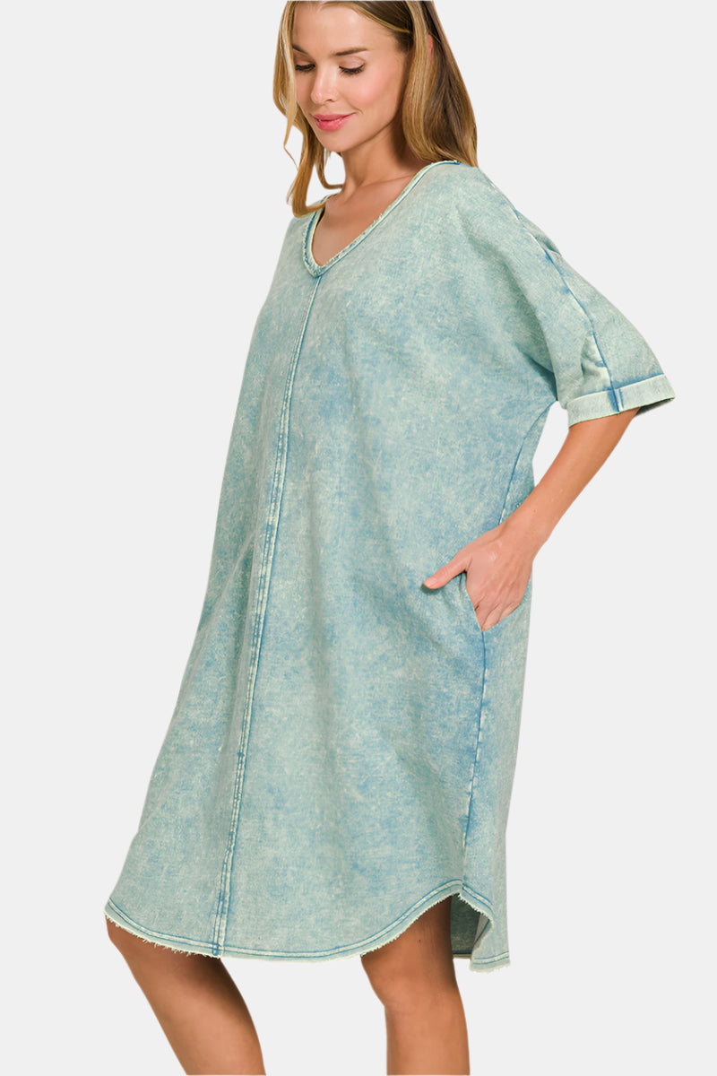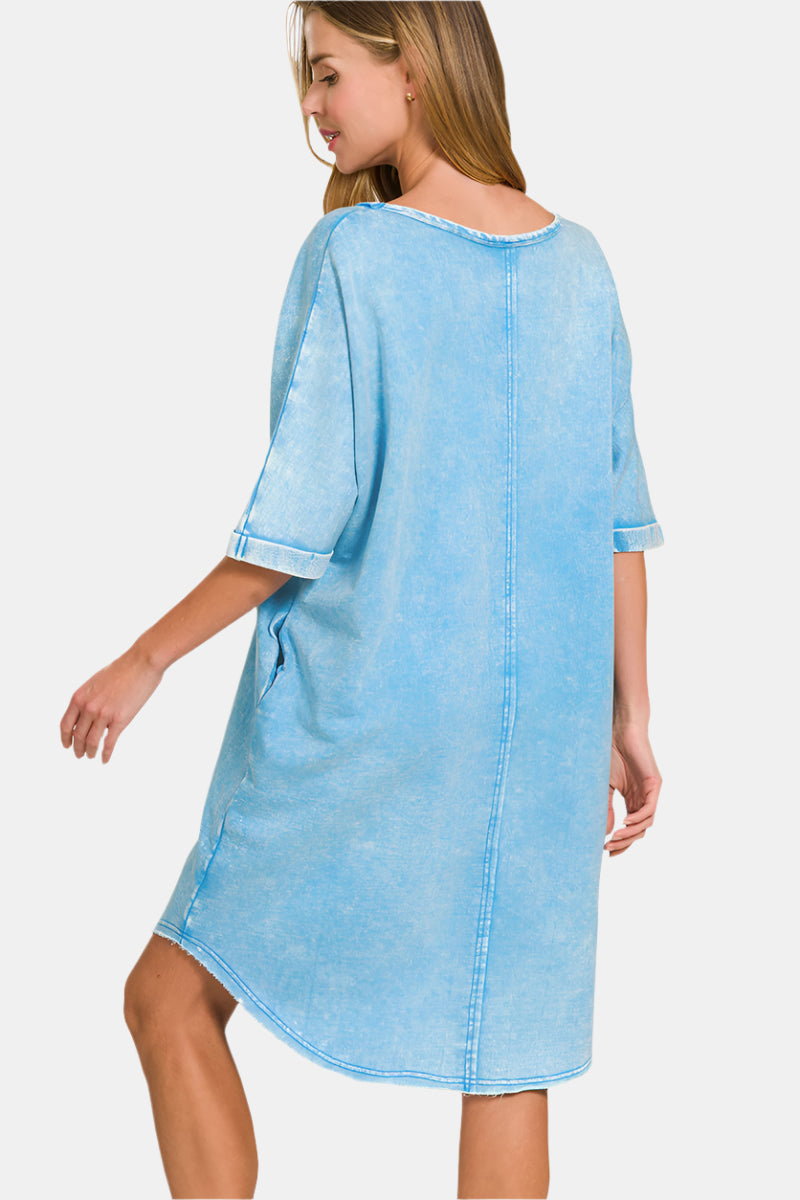 Acid-Washed French Terry Tee Shirt Dress / ASH BLUE