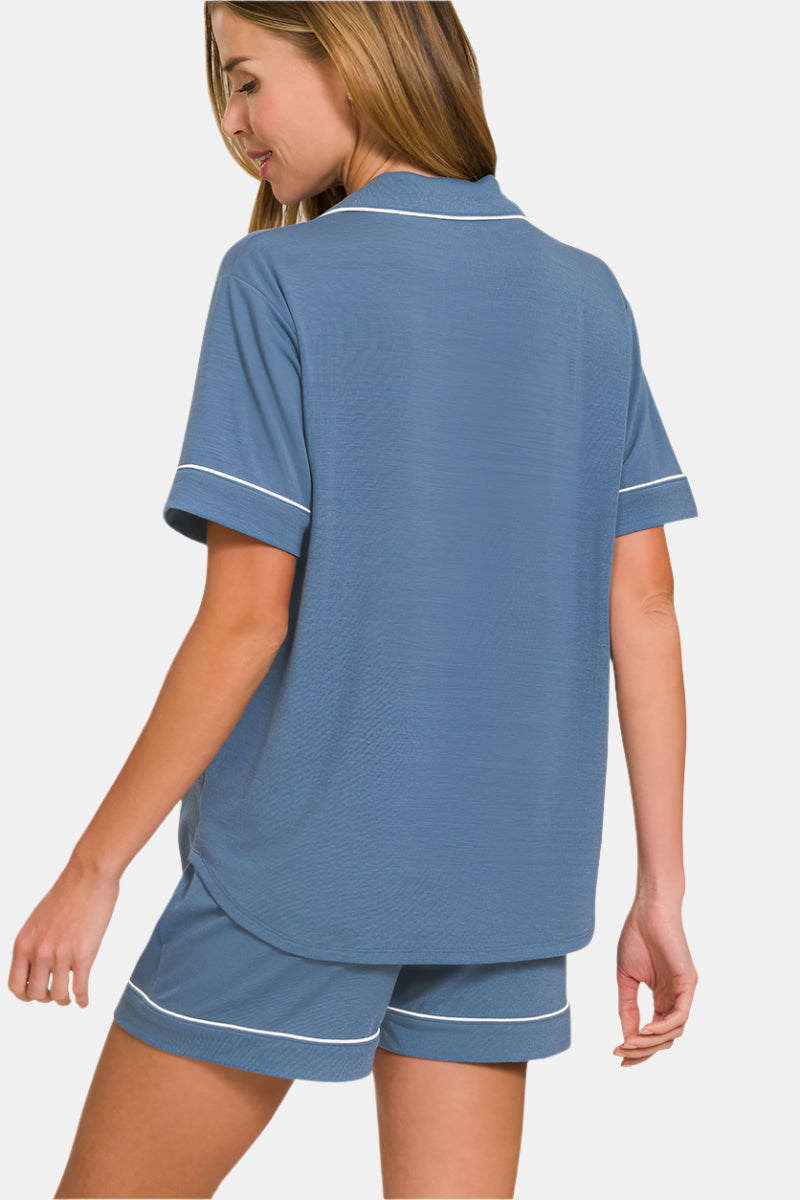 Contrast piping outlines soft knit short PJs that pair a button-up top with elastic waist shorts to complete the set.