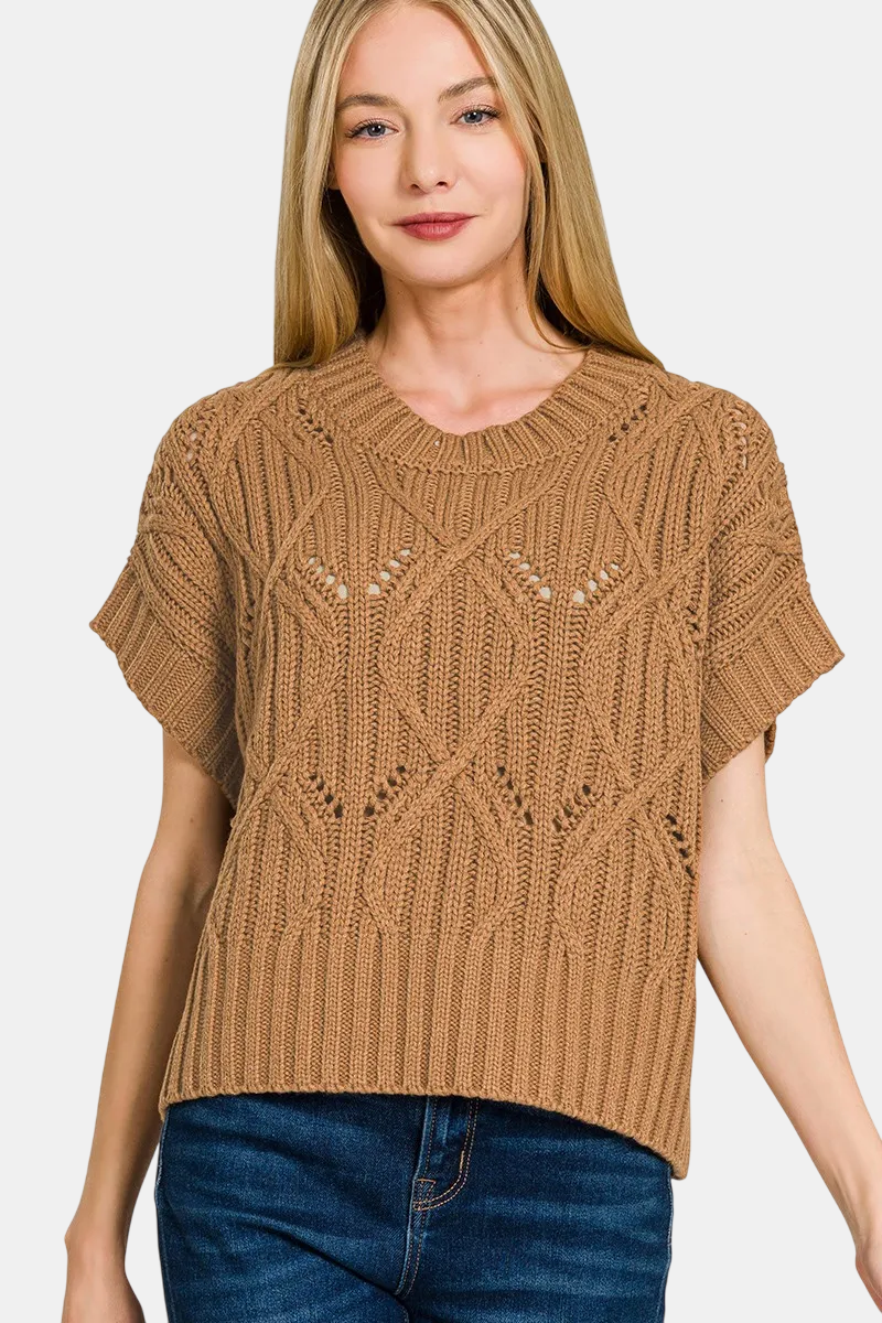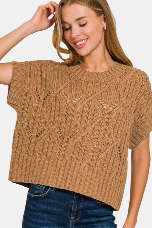 Cable Knit Short Sleeve Sweater / DEEP CAMEL