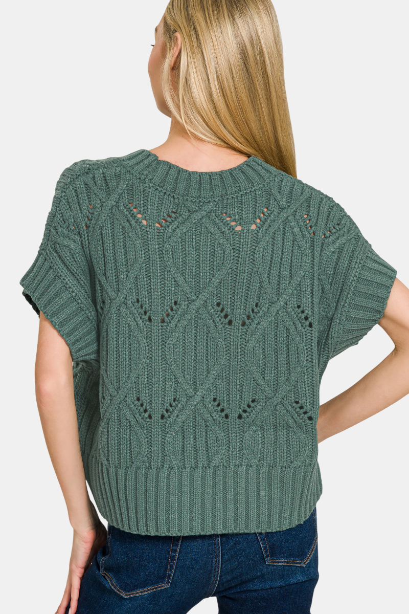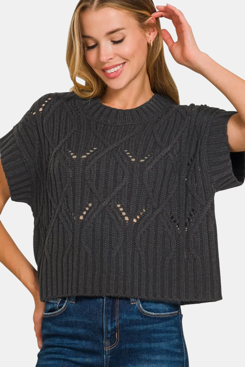 An oversized cable knit sweater with open stitching offers a breezy, lightweight take on classic texture.