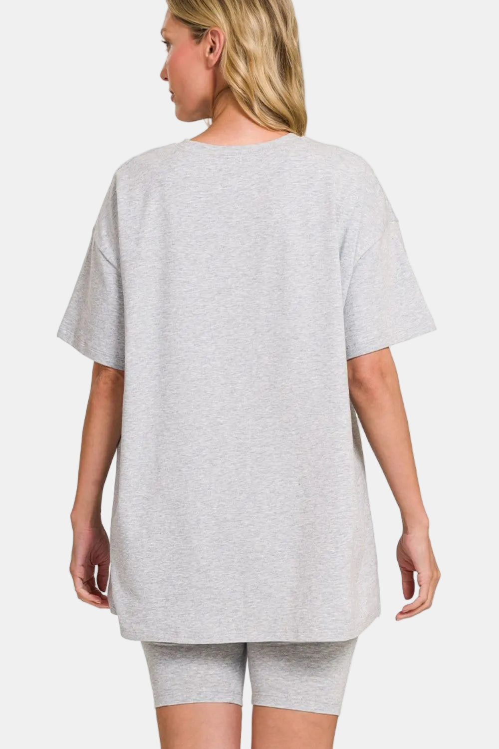 Feel the comfort of this soft cotton set featuring a short sleeve round neck top and biker shorts.