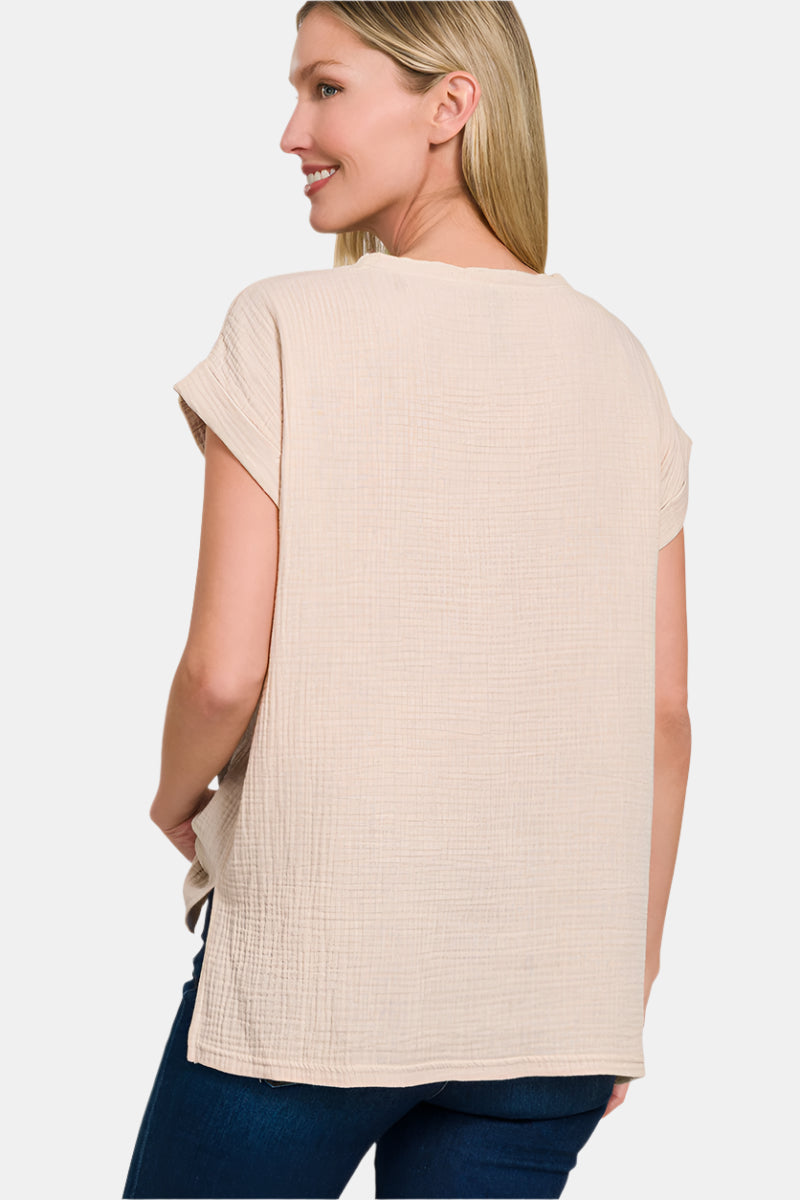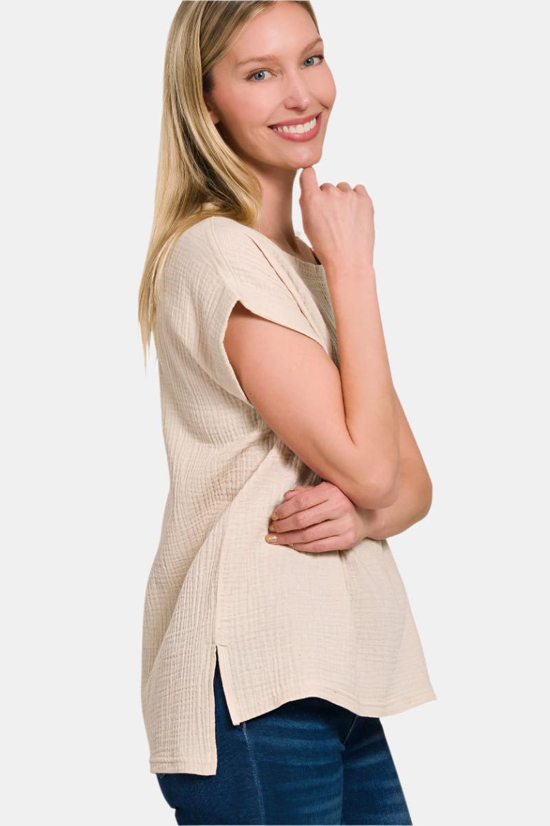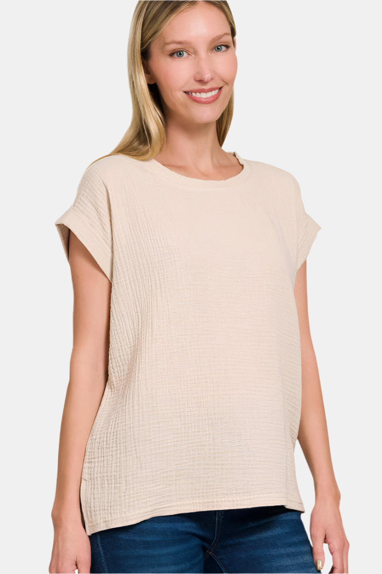 Double Gauze Round Neck Folded Short Sleeve Top / SAND BEIGE