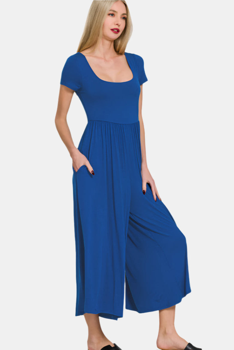 Cut from a soft and stretchy rayon blend, this ready-for-anything jumpsuit features a soft square-neckline and flowy wide legs.