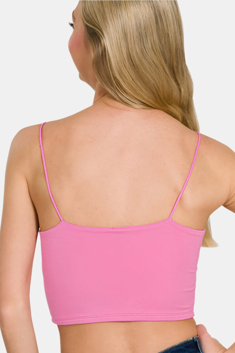 Stretchy spaghetti straps anchor this cute cropped cami that layers extremely well.