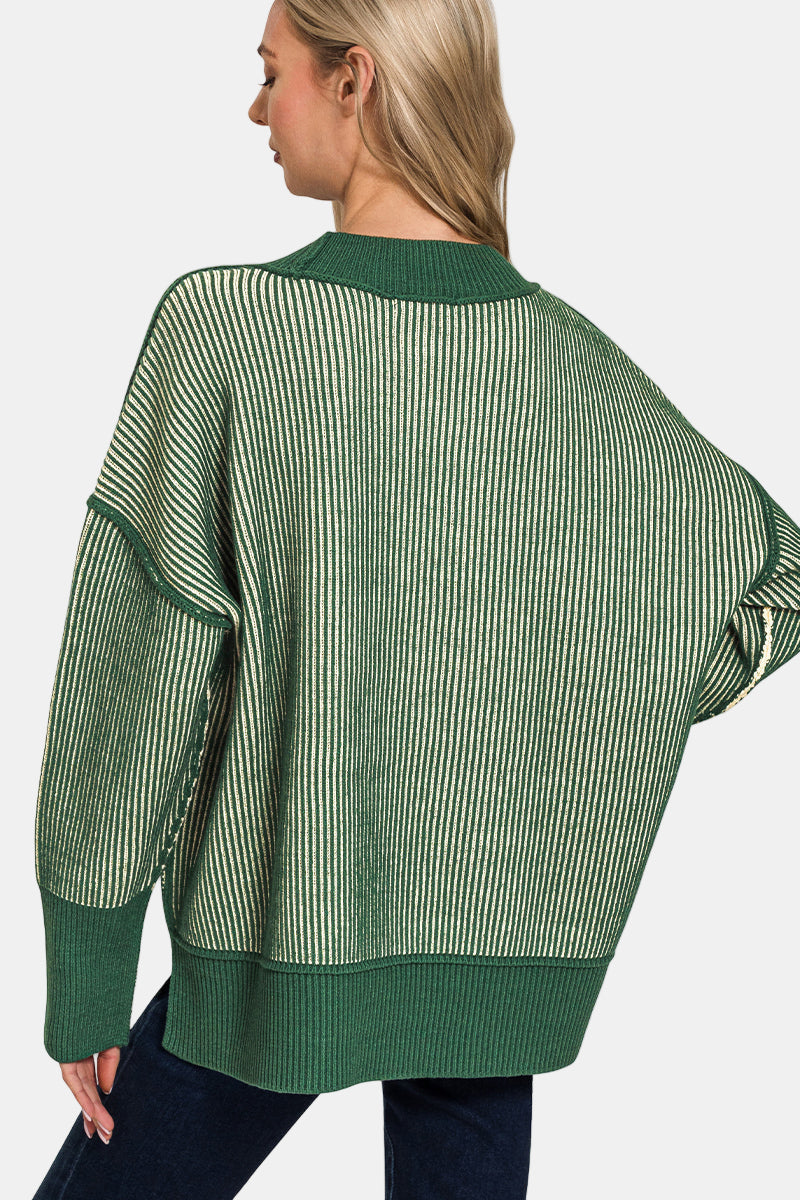 An oversized two-tone ribbed sweater with exposed seams, hi-lo hem, and side slits brings relaxed ease to everyday wear.