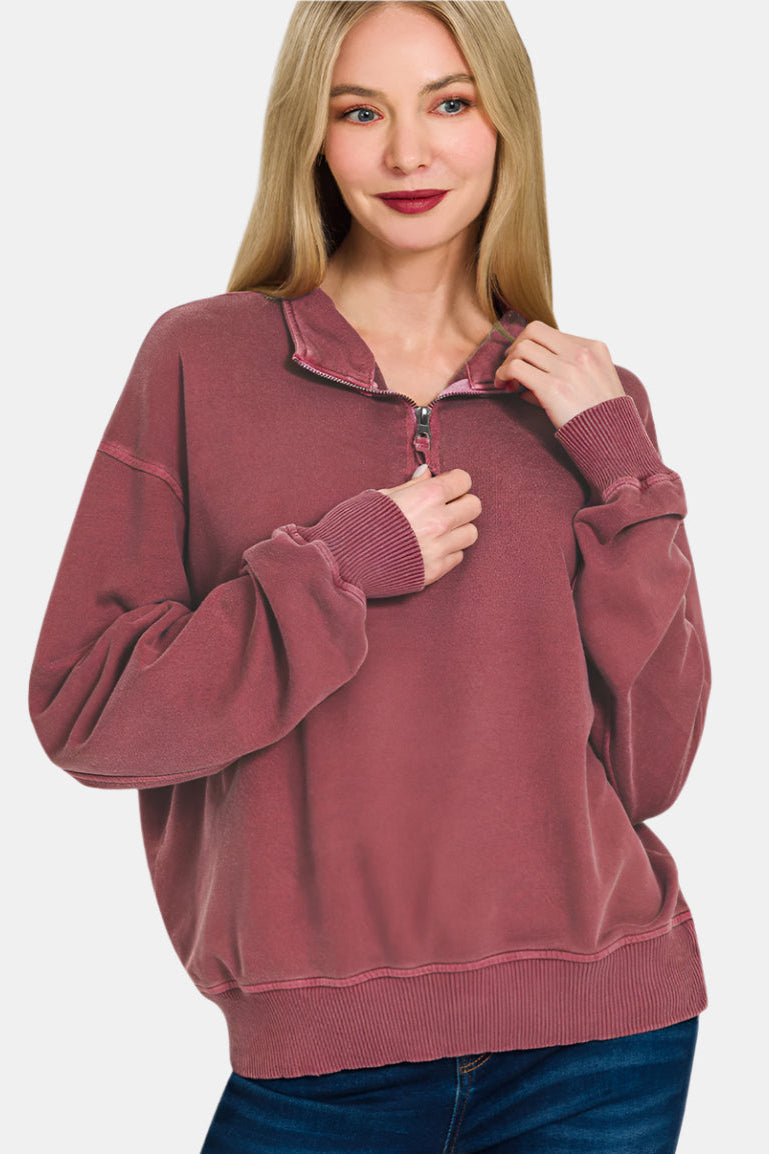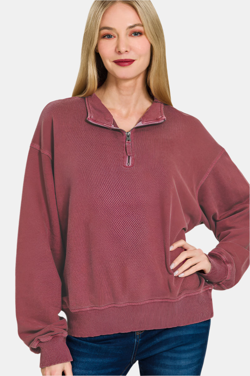 F/Terry Pigment Dye & Enzyme Washed Half Zip Top / CABERNET