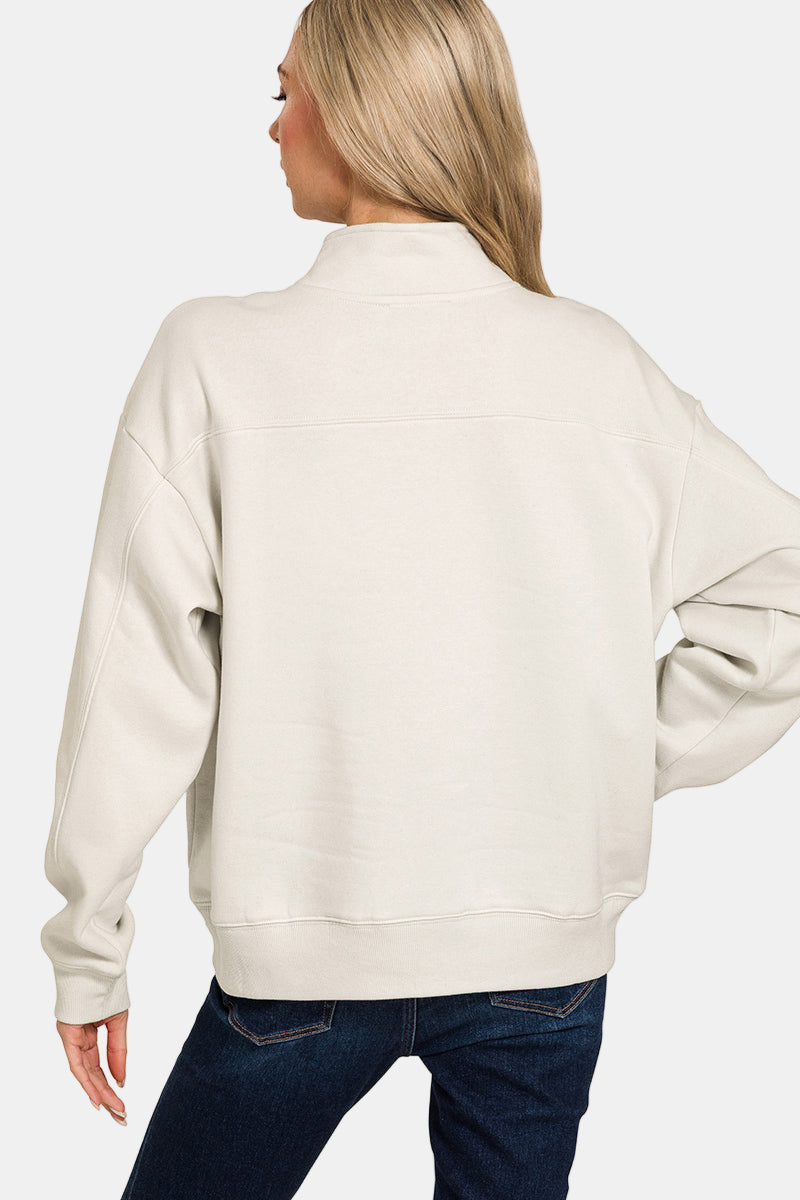 Soft fleece adds comfort to a half-zip sweatshirt styled with a mock neckline and dropped shoulders.