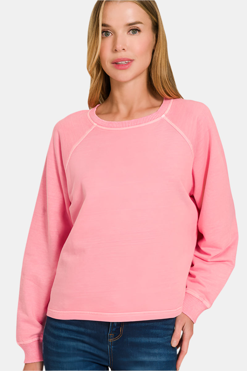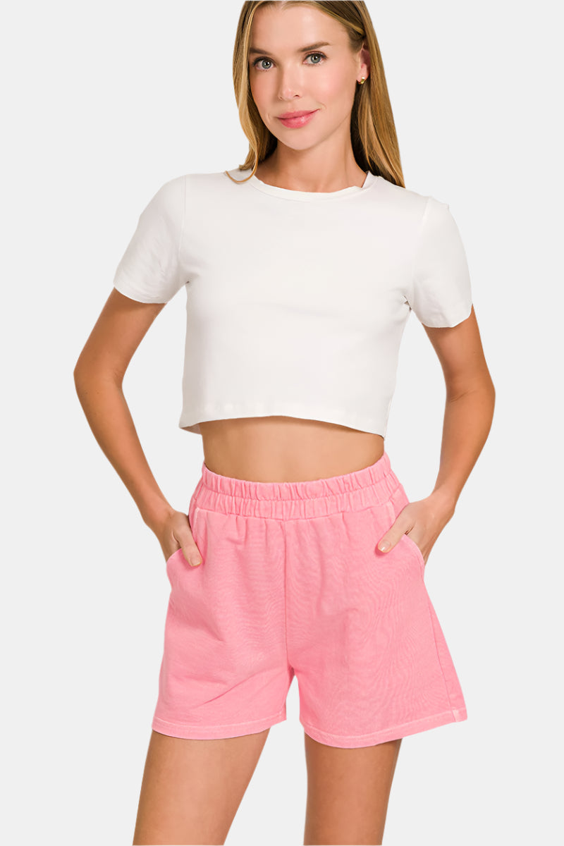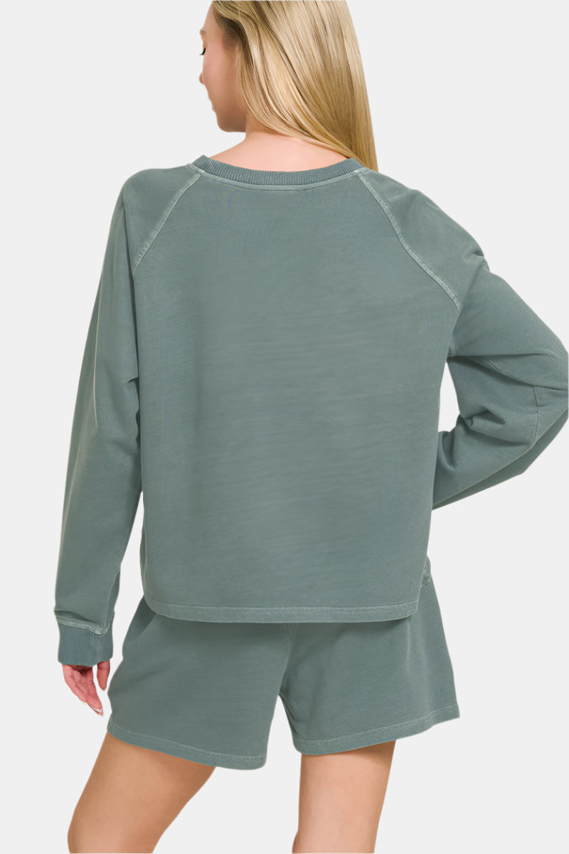 Made in 100% cotton, this pigment-dyed French terry set pairs a soft-washed pullover with matching shorts for laid-back, lived-in style.