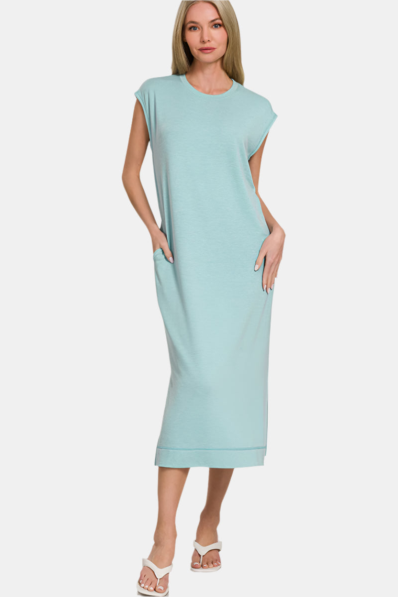 French Terry Sleeveless Round Neck Midi Dress / DUSTY TEAL