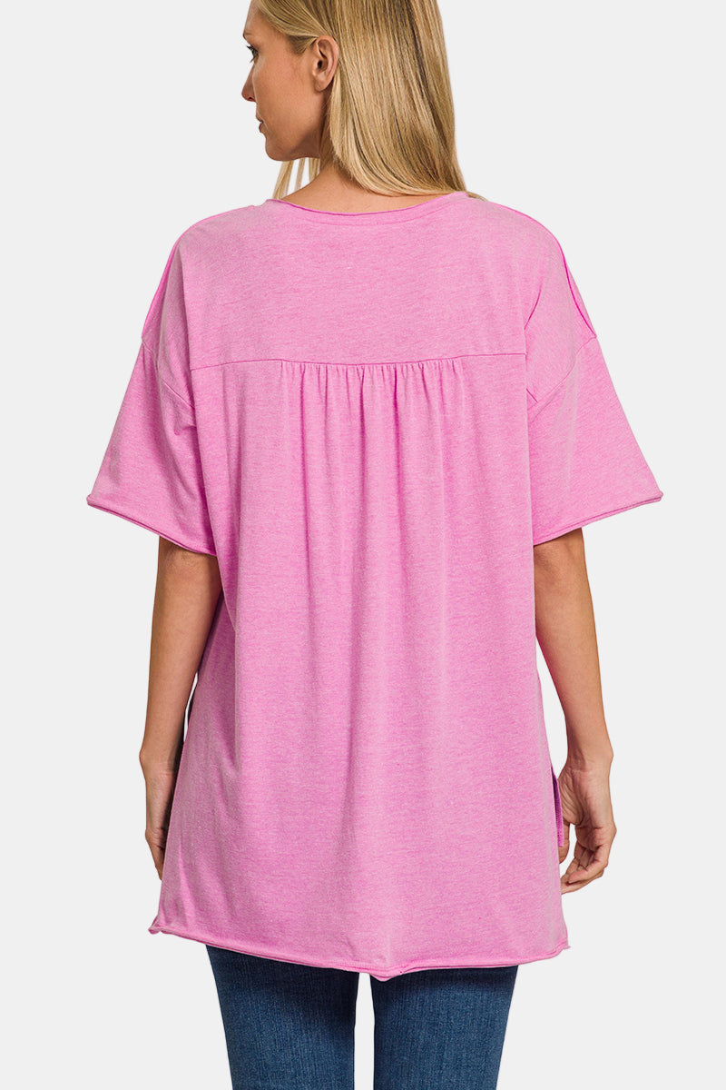 Dropped shoulders lend a slouchy fit to this relaxed V-neck T-shirt cut with raw edges.