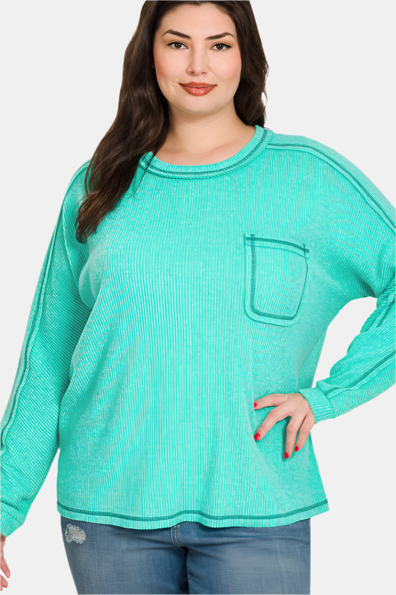 Brushed Ribbed Hacci Round Neck Sweater / TURQUOISE