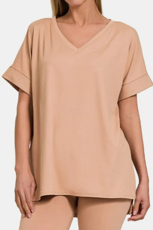 Lounge like a dream in this supersoft brushed microfiber set that pairs cozy leggings with a rolled short sleeve v-neck top starring a hi-low hem.