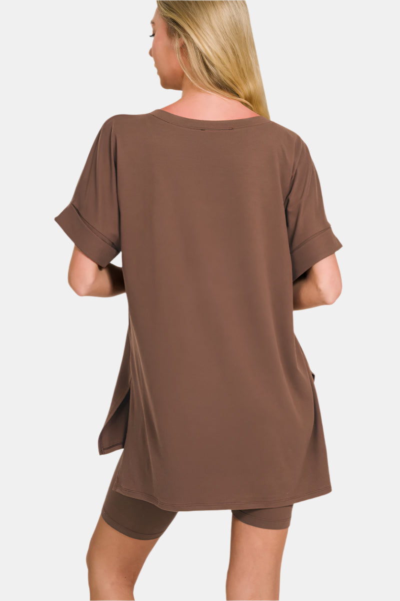 Drowse and lounge in this supersoft brushed microfiber set featuring a V-neck hi-low hem top with side slits and biker shorts.