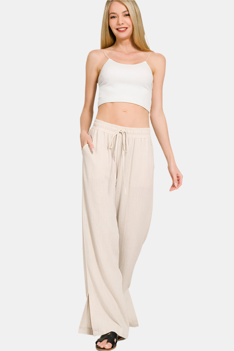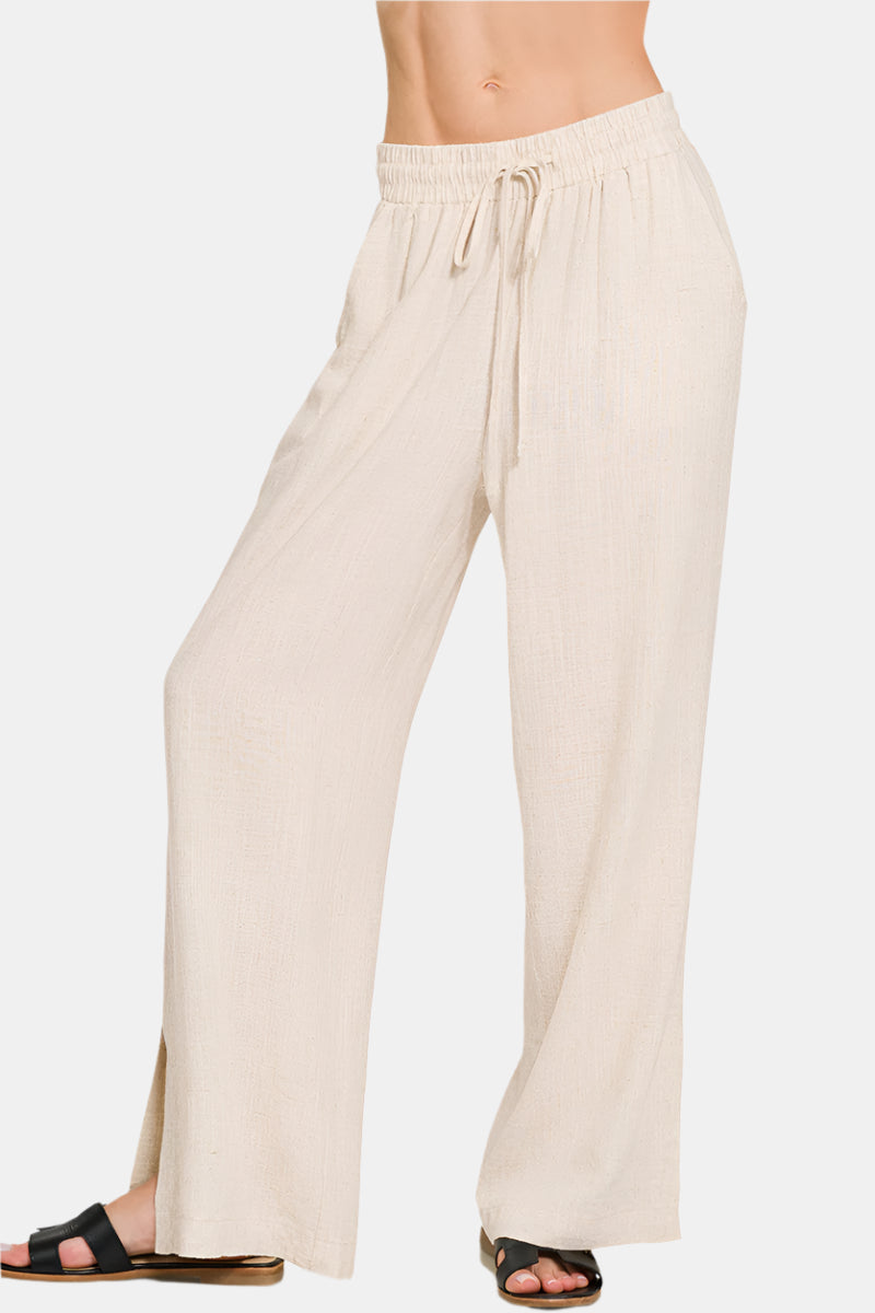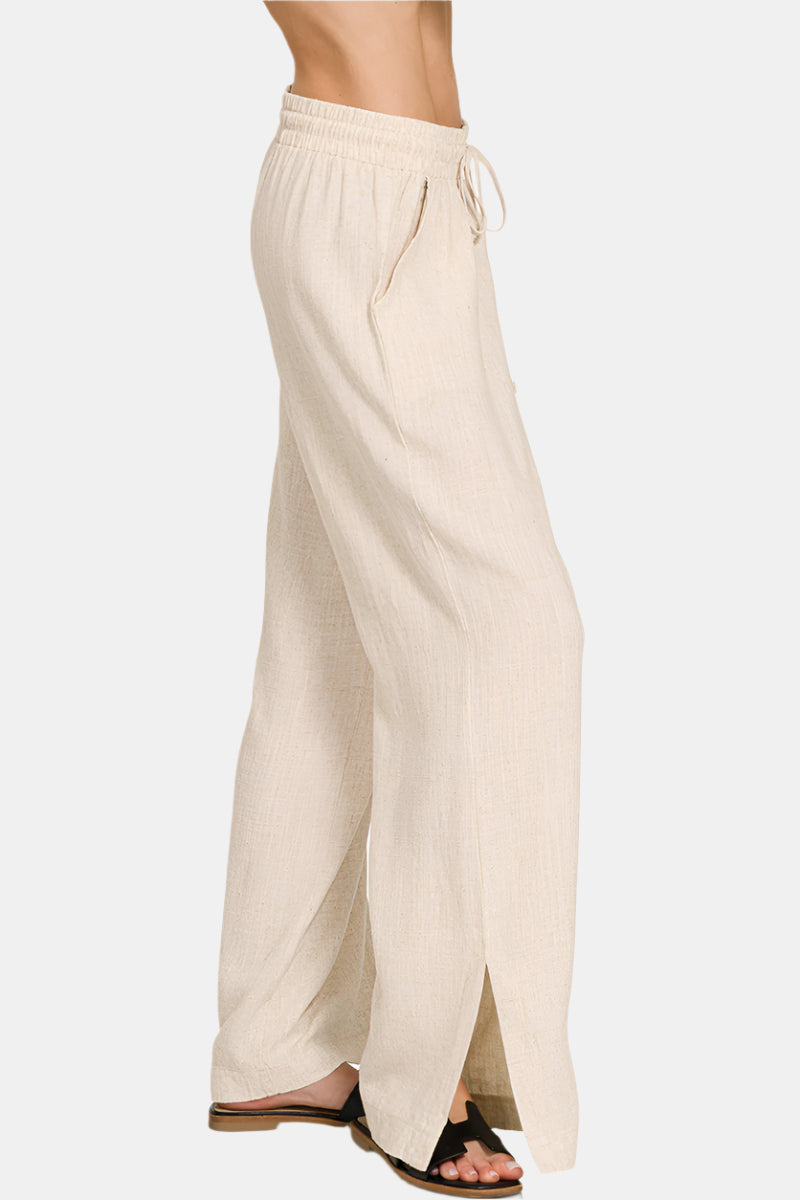 Linen Drawstring Pants With Side Slits / SAND BEIGE