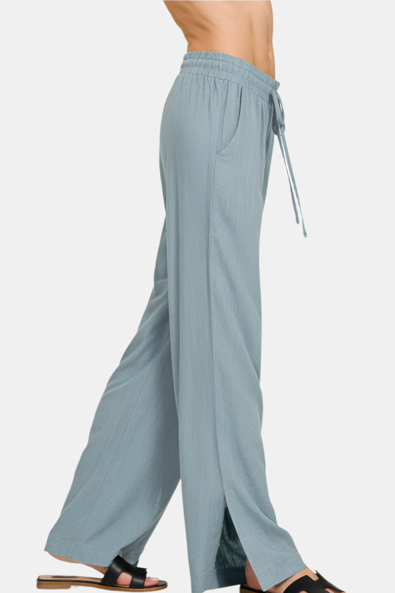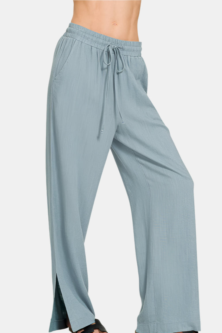 Linen Drawstring Pants With Side Slits / BLUE GREY