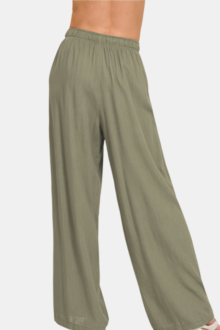 These lightweight linen-blend pants are cut with flowy wide legs and topped with a comfortable elastic waist.