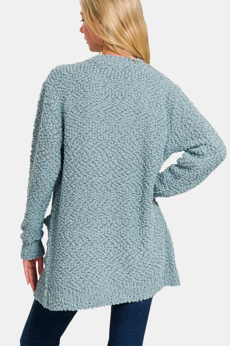 Long Sleeve Popcorn Sweater Cardigan with Pockets / BROWN