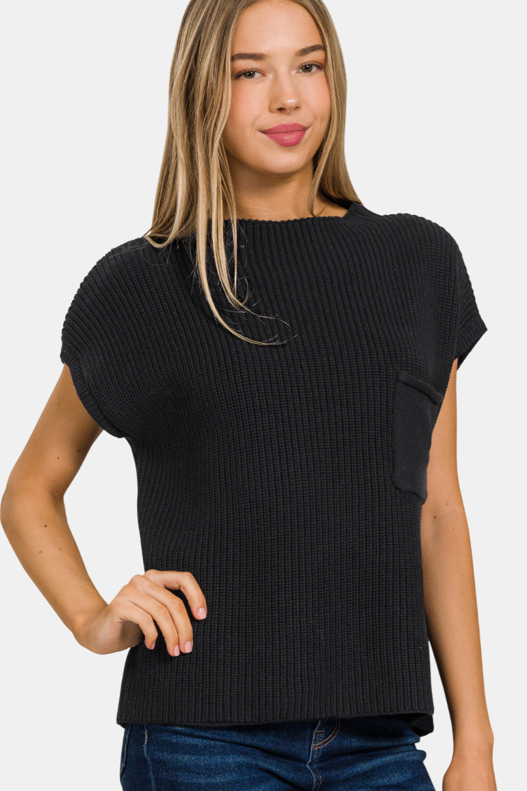 A staple mock-neck sweater is designed with a chest pocket and abbreviated dolman sleeves.