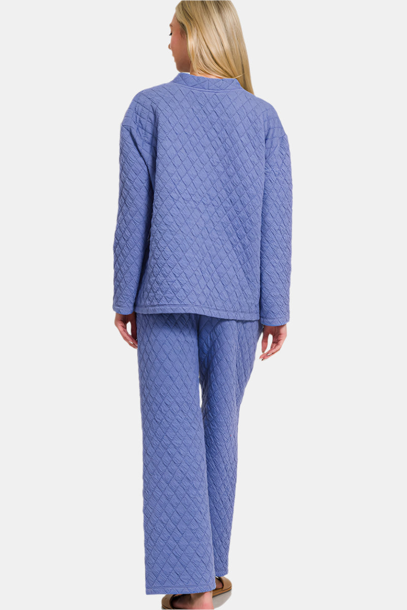 Take a chilly-day stroll in this cozy quilted set featuring a jacket with pockets and elastic waist pants.