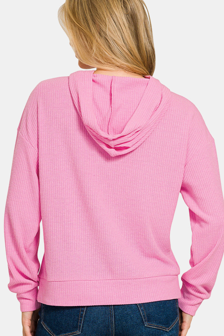 Chilly days call for the relaxed fit of this hooded sweater made from soft ribbed knit.