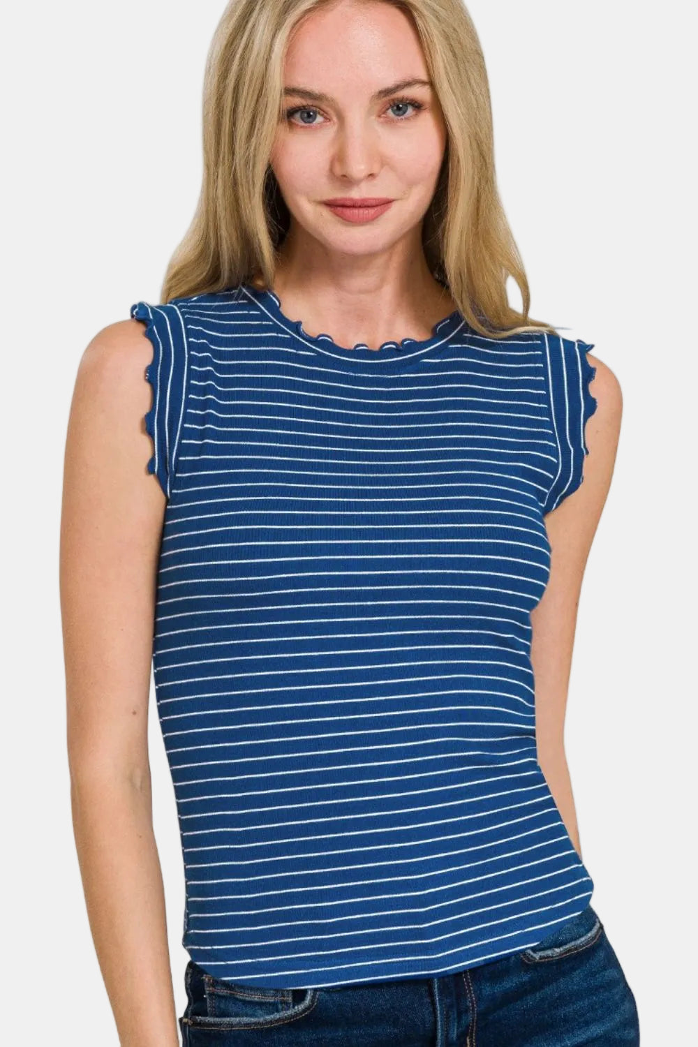 Ribbed Ruffle Trim Sleeveless Stripe Top / LT NAVY/WHITE