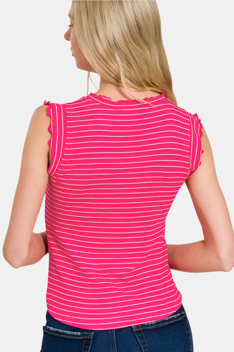 A stripe pattern brings texture to a ribbed knit sleeveless top finished with ruffle trims.