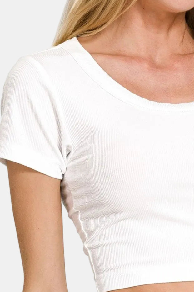 Ribbed Scoop Neck Crop Short Sleeve Top / WHITE