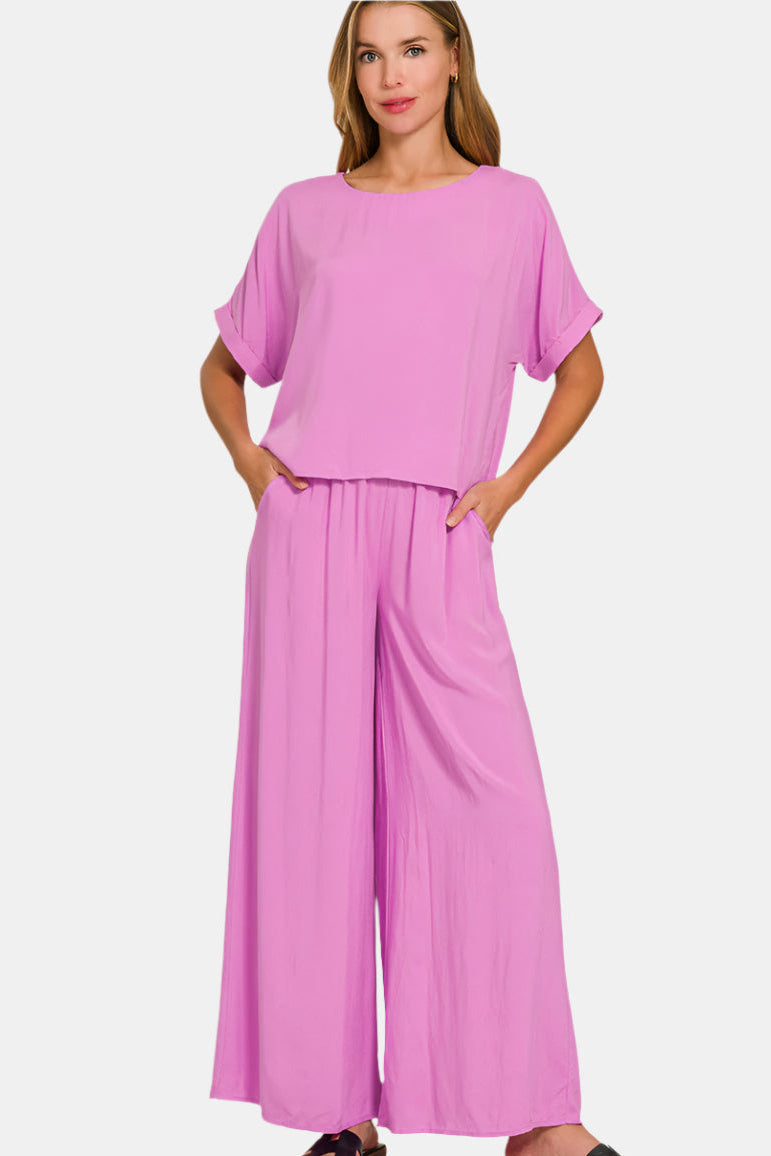Woven Short Sleeve & Long Pants Set / BRIGHT MAUVE