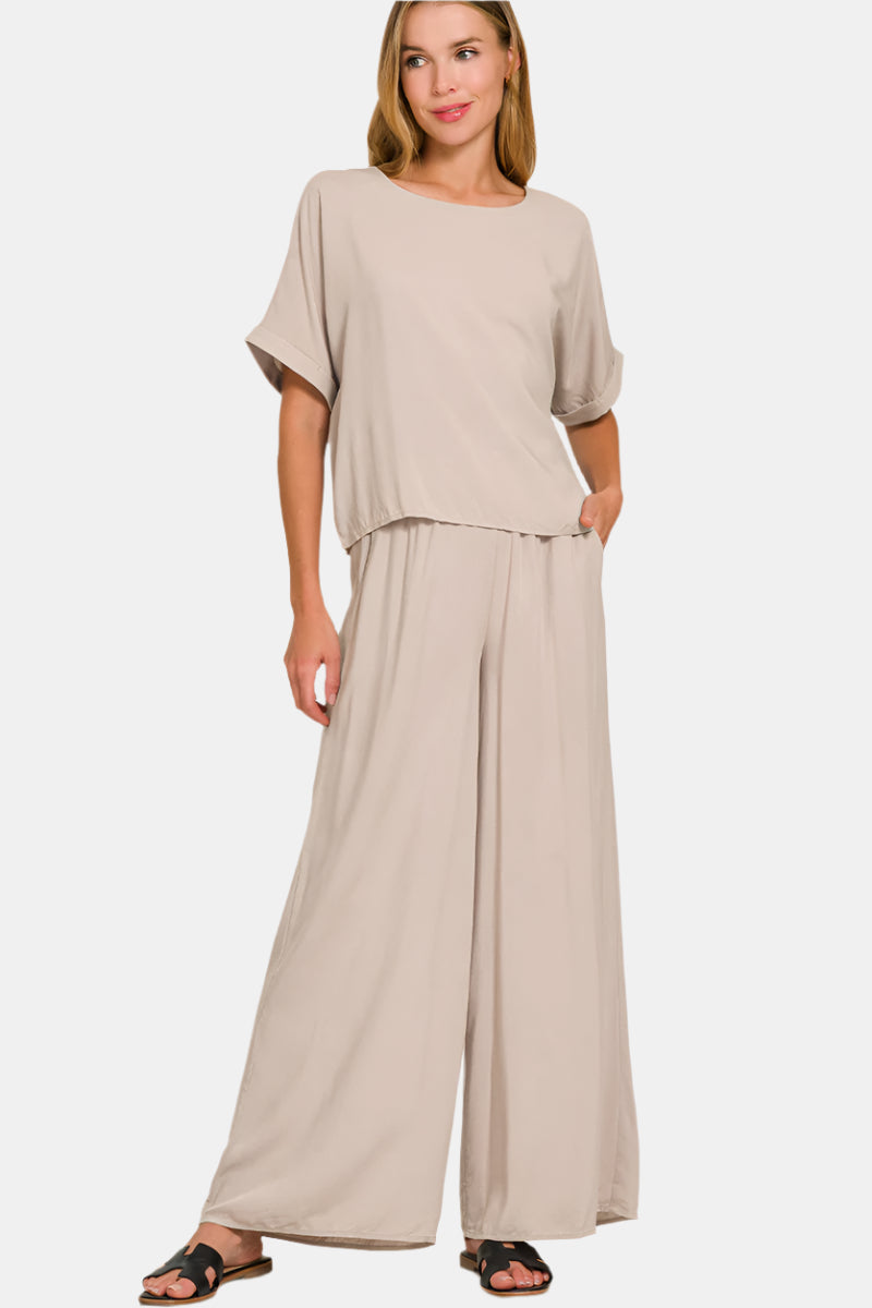 Woven Short Sleeve & Long Pants Set / ASH MOCHA