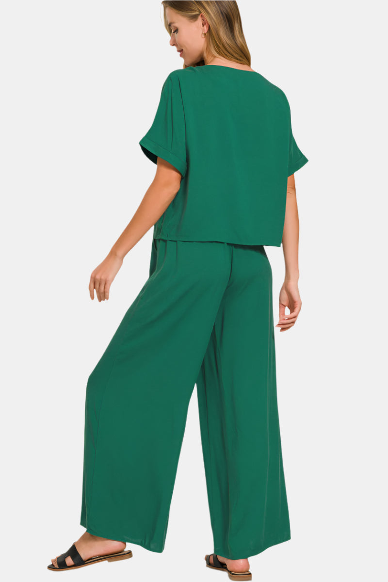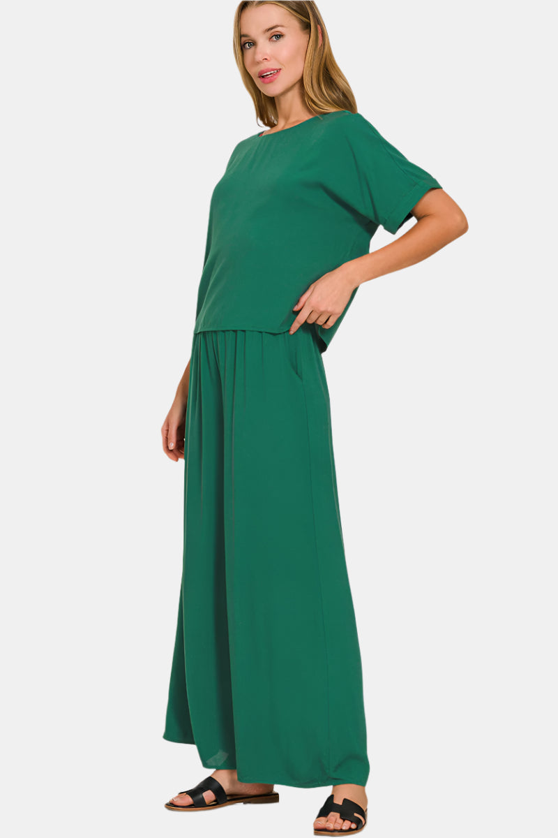 Woven Short Sleeve & Long Pants Set / DK GREEN