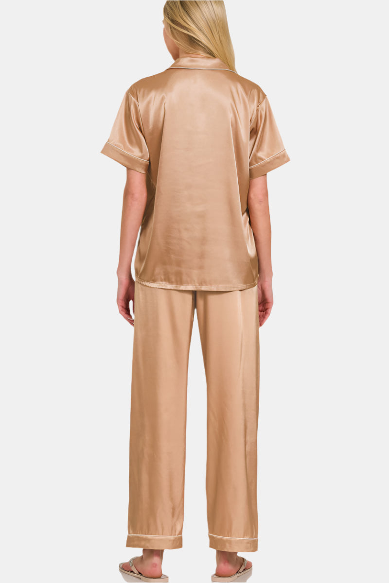 Lounge in the luxe comfort of these satin pajamas with wide-leg pants and a matching top.