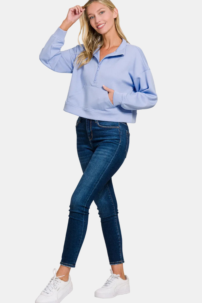A lightweight scuba fabric brings comfort to a cropped pullover designed for versatility wherever you go.