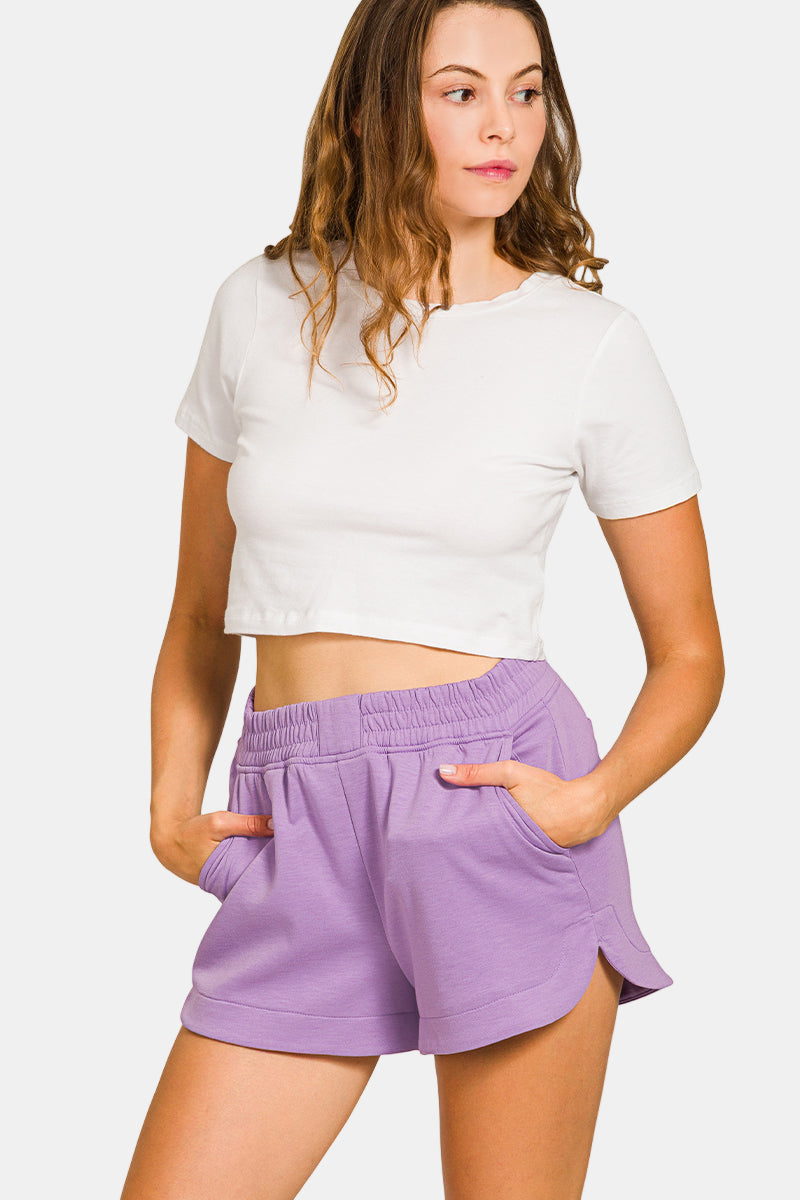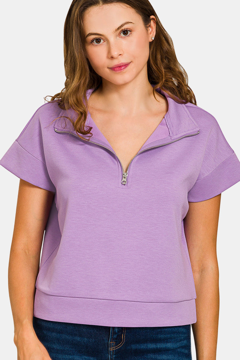 A half-zip sweatshirt and pocketed shorts set offers versatile neckline styling and ease for laid-back days.