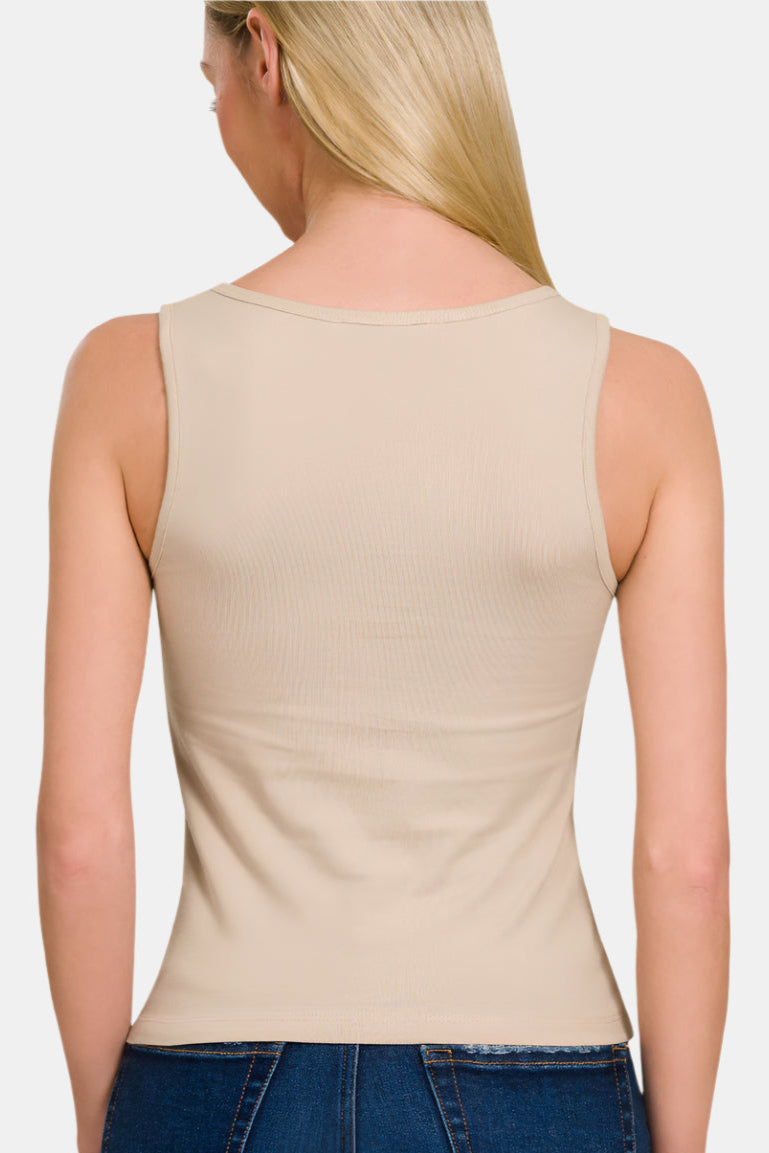 A wide square neckline gives this stretchy cotton tank top an eye-catching look.