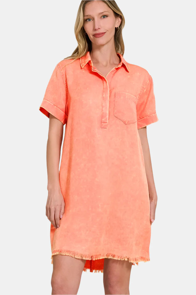 Tencel Mineral Washed Collared Shirt Dress / CORAL