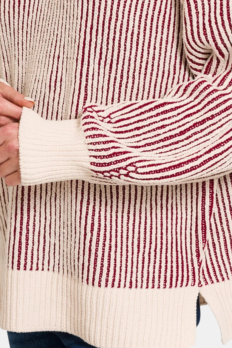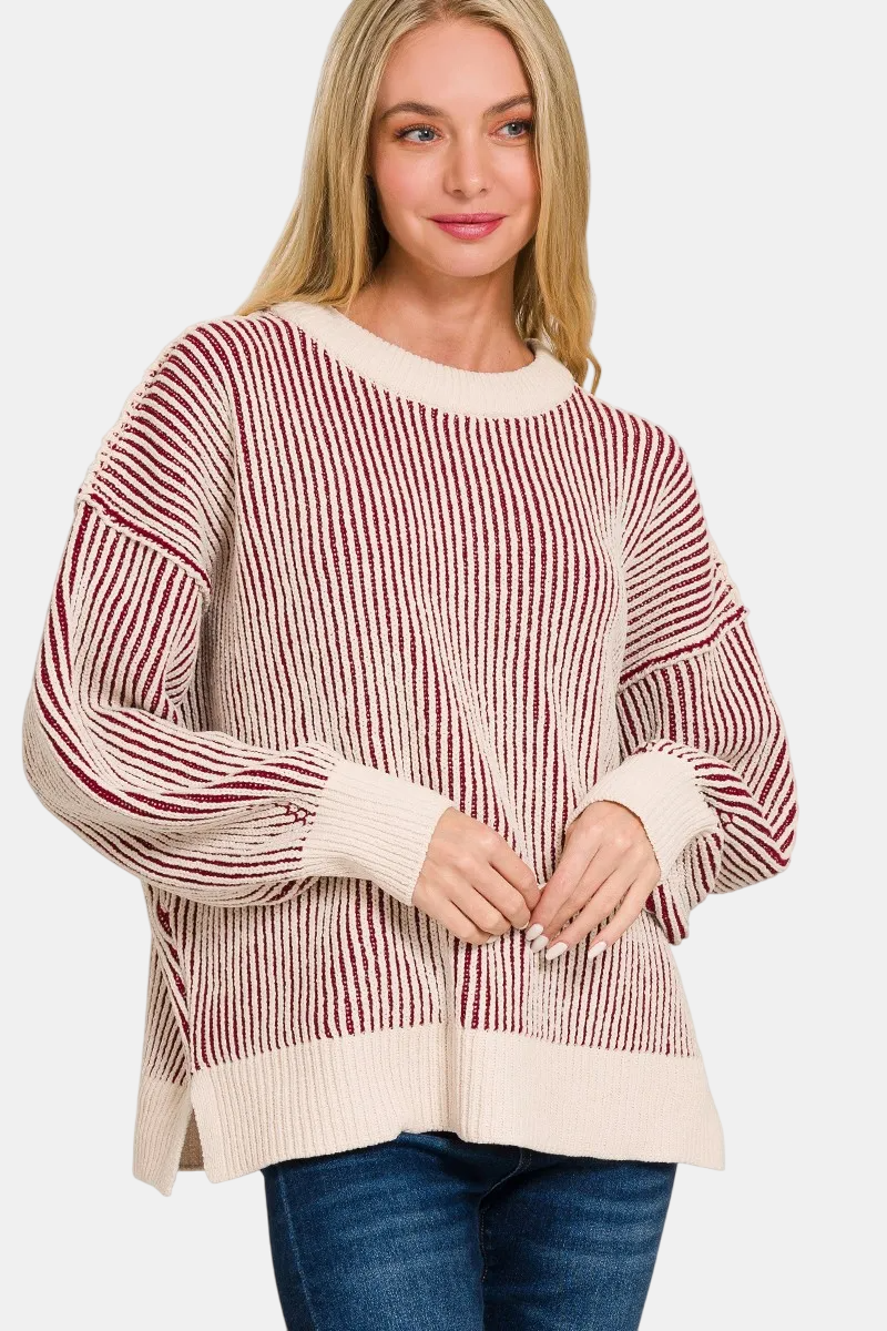 Two-tone stripes and balloon sleeves define this oversized crewneck sweater with drop shoulders and side slits.