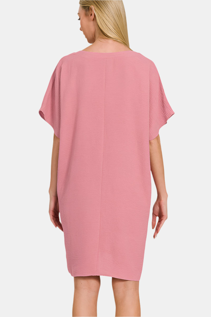 Woven Airflow V-Neck T-Shirt Dress With Pockets / BLACK
