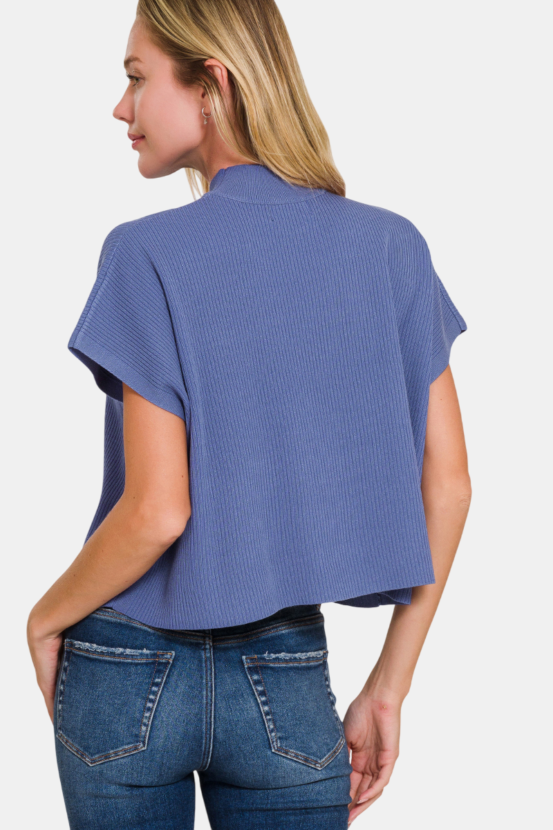 Viscose Mock Neck Short Sleeve Boxy Sweater / BLACK