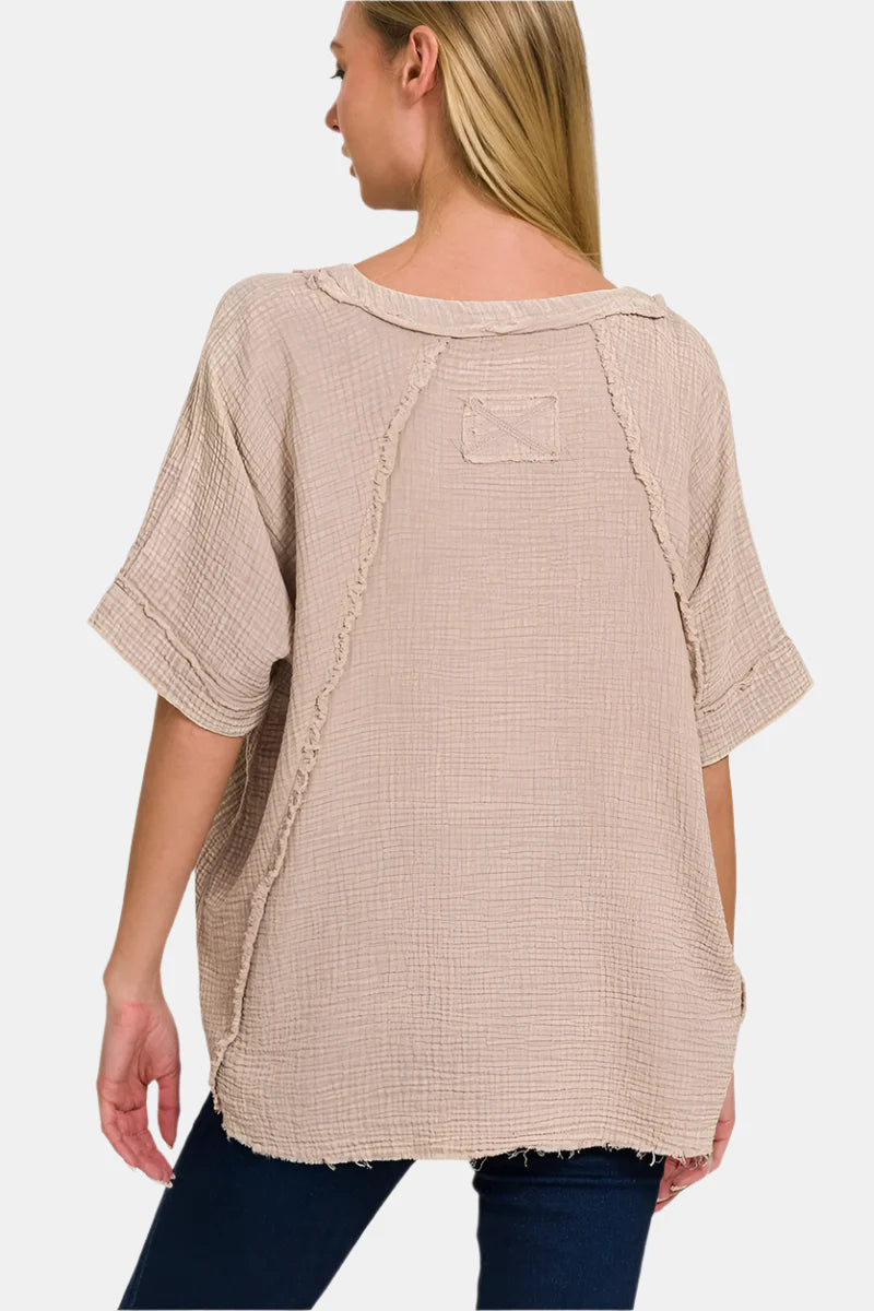 Light and airy in cotton double gauze, this washed shirt features raglan sleeves and raw edges for effortless style.