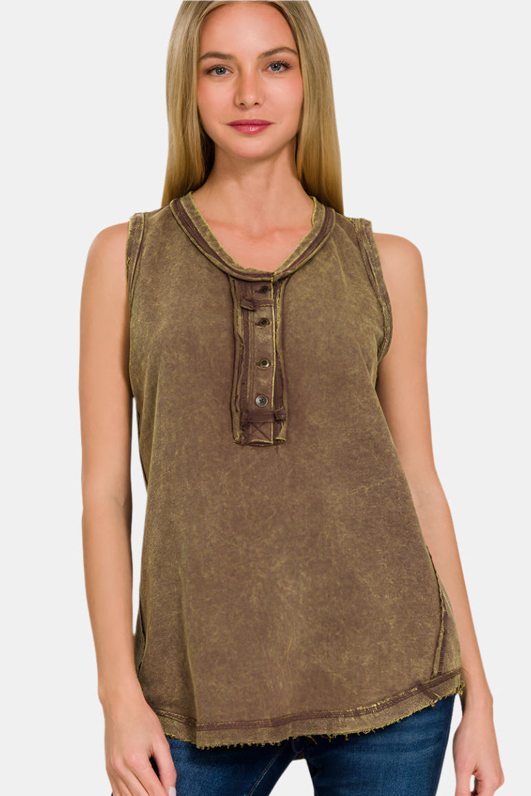 Washed Half-Button Raw Edge Sleeveless Henley Top / MAHOGANY