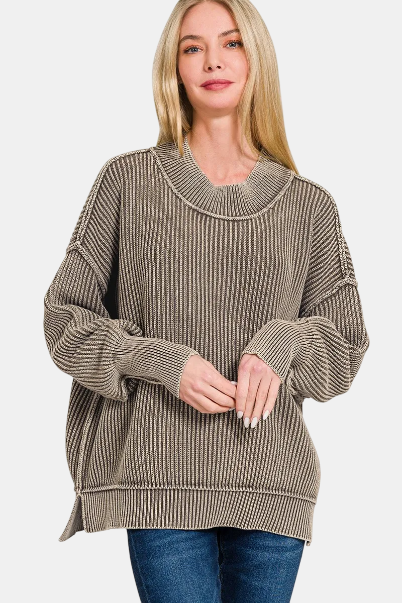A heavyweight washed sweater with side slits and a hi-low hem brings cozy dimension to an oversized silhouette.
