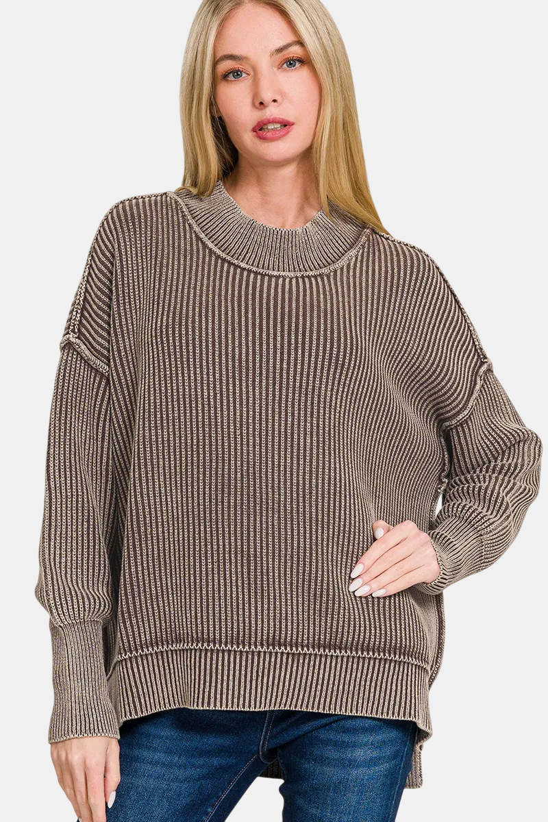 A heavyweight washed sweater with side slits and a hi-low hem brings cozy dimension to an oversized silhouette.