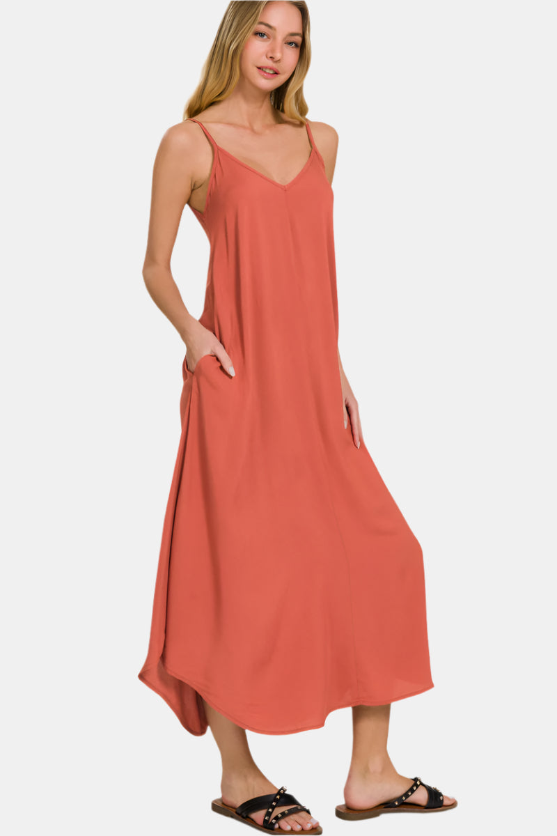 Woven Arc Hem Flowy Cami Dress With Pockets / RUST
