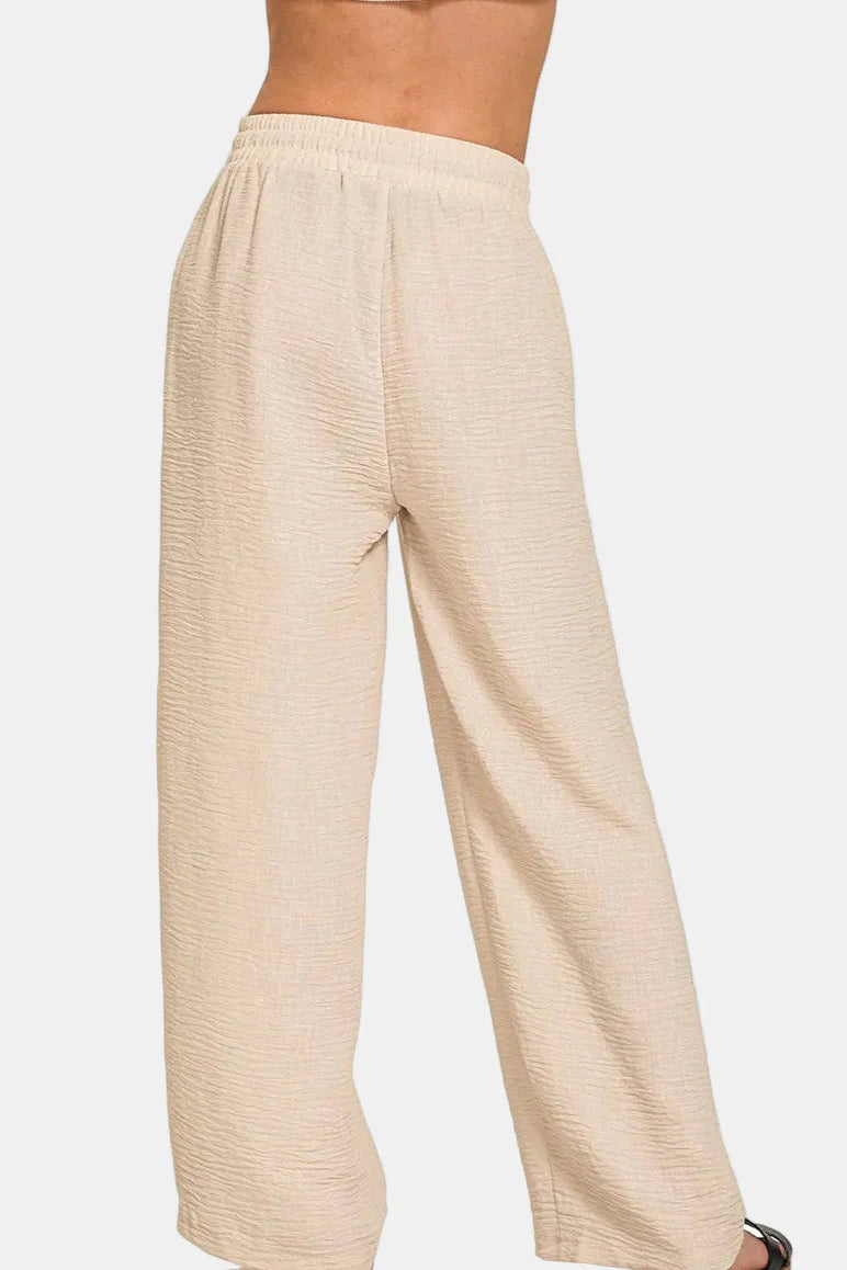 Crafted from lightweight crepe, these elastic waist pants feature breezy wide legs for vacation ready vibes.