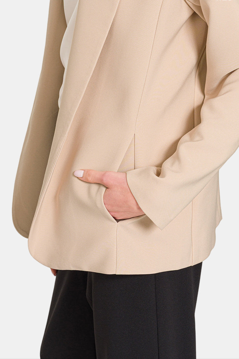 Complete your look with a polished touch when you add this open front jacket cut in a relaxed style.