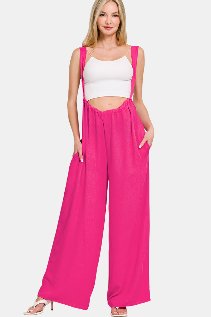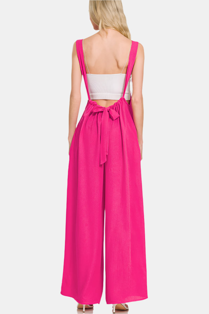 Woven Tie Back Suspender Jumpsuit / HOT PINK